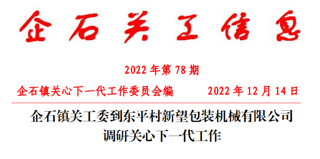 12 14 日上午,企石鎮(zhèn)關(guān)工委到東平村新望包裝機(jī)械有限公司調(diào)研關(guān)心下一代工作。企石鎮(zhèn)關(guān)工委主任楊煥柱,關(guān)工委副主任黃林燦、劉毅然,東平村關(guān)工委主任李堯木,公司董事長羅永輝等參加了調(diào)研活動。